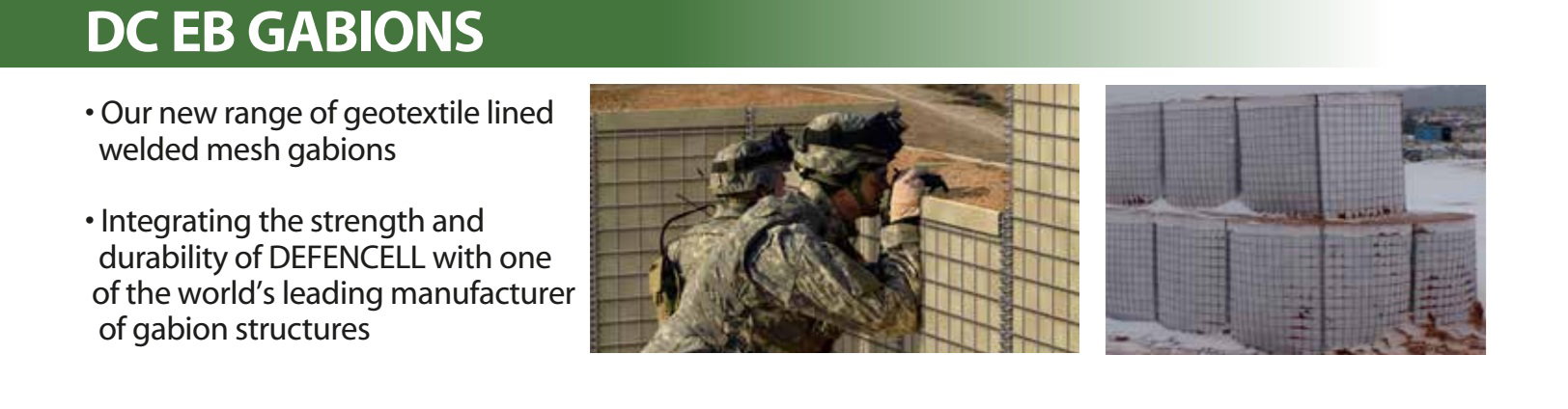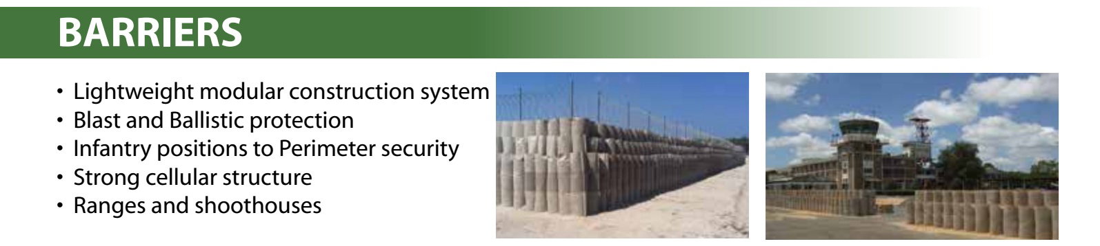 The DefenCell™ barrier system provides personnel and infrastructure protection in Military, Security and Environmental applications. Lightweight, man portable and non-metallic with a small logistical footprint, it is available in various flexible and modular configurations from individual positions up to complete forward bases and can be deployed rapidly, with or without engineering support.In both military and security applications it affords protection from small arms fire right up to VBIEDs and artillery. In the environmental sphere, DefenCell™'s proven geocell technology makes it ideal for flood protection and ground stabilisation.